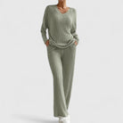 A V-neck sweater + wide-leg ribbed pants = loungewear that feels modern, clean and classy.